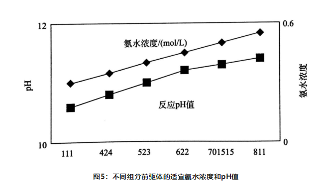 由于鎳、鈷、錳的沉淀pH值不同,所以不同組分的三元材料前驅(qū)體的最佳反應pH值不同。
